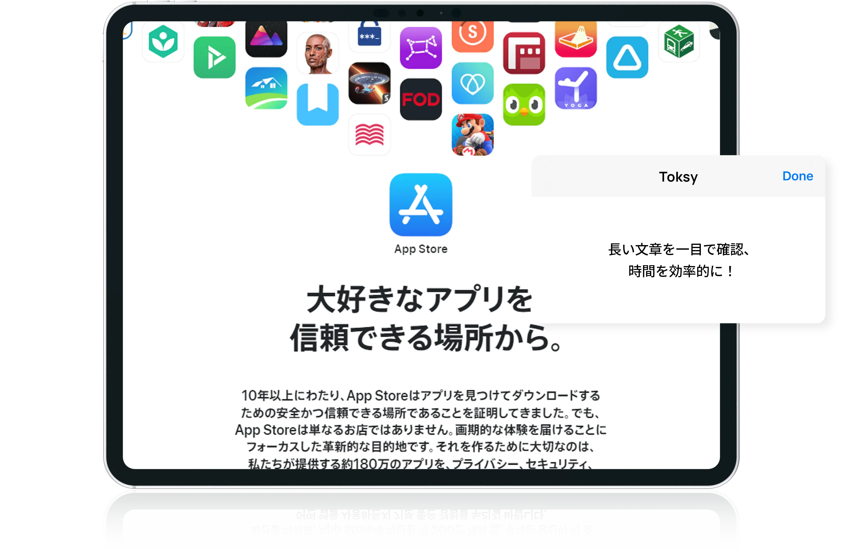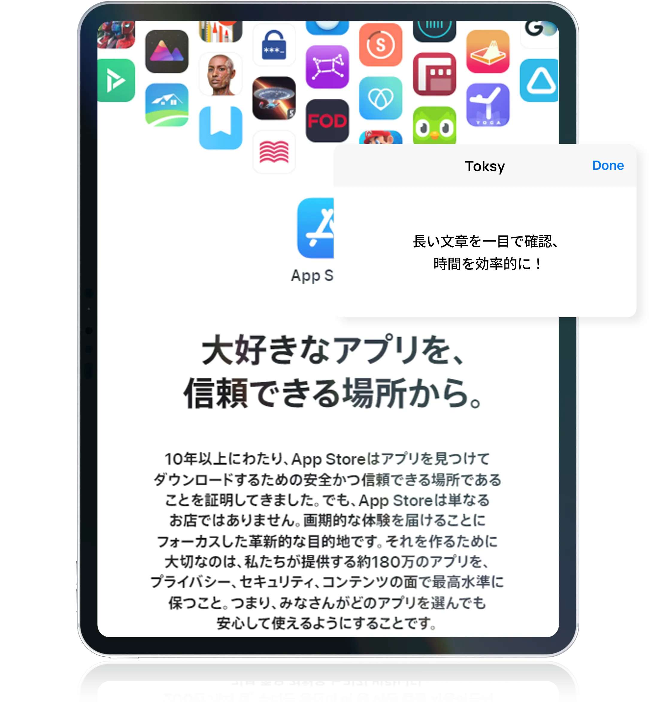 Toksyは複雑で膨大な文章も、わずか数秒で把握できるようサポートします。
